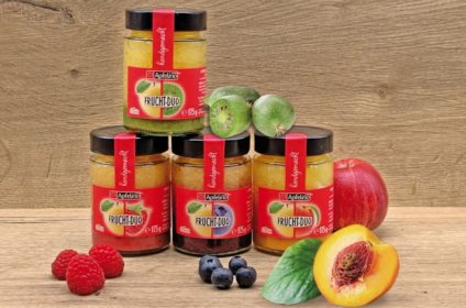 geriebener Apfel mit Himbeere, Kiwibeere, Pfirsich oder Heidelbeere jeweils im 175-Gramm-Glas