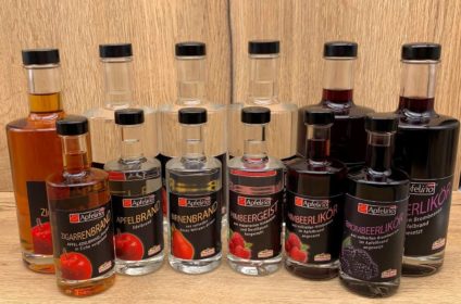 Apfelbrand, Williams-Birnenbrand, Himbeergeist, Kiwibeerenbrand, Zigarrenbrand Pinova jeweils in der 0,35 L- bzw. 0,10 L- Flasche und Himbeer-Edelbrand 0,35 L in der edlen Geschenkkassette