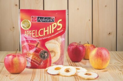 knusprige Apfelchips 50 g, knusprige, geriffelte Apfelchips 50 g, Apfelstücke weich&soft 70 g, Knusperwürfel Apfel 25 g