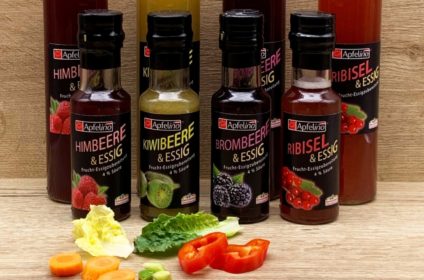 Fruchtessigzubereitungen: Brombeere & Essig, Himbeere & Essig, Kiwibeere & Essig, Ribisel & Essig jeweils in der 0,5 L- bzw. 0,10 L-Flasche