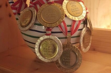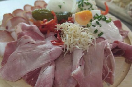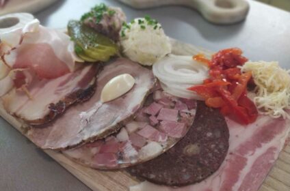 GenießerInnen aufgepasst! Eine Spezialität ist unser Speck, der schon einige Male mit Silber- und Goldmedaillen ausgezeichnet wurde. Nach Traudis Rezept wird das Fleisch gesurt und über Buchenholzspänen mild geräuchert. Nach der Reifezeit erhält der Speck seinen vollen Geschmack und seine goldbraune Farbe.
