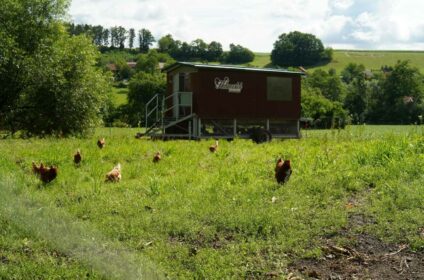 Wird den Hühnern im Camper langweilig, haben sie natürlich die Möglichkeit, außerhalb des Anhängers zu gackern, picken und scharren. Außerdem reisen unsere Hühner samt Anhänger regelmäßig übers Grundstück, um eine Erholung der Grasnarbe und weniger Parasitendruck zu garantieren und einer punktuellen Überdüngung entgegenzuwirken.
